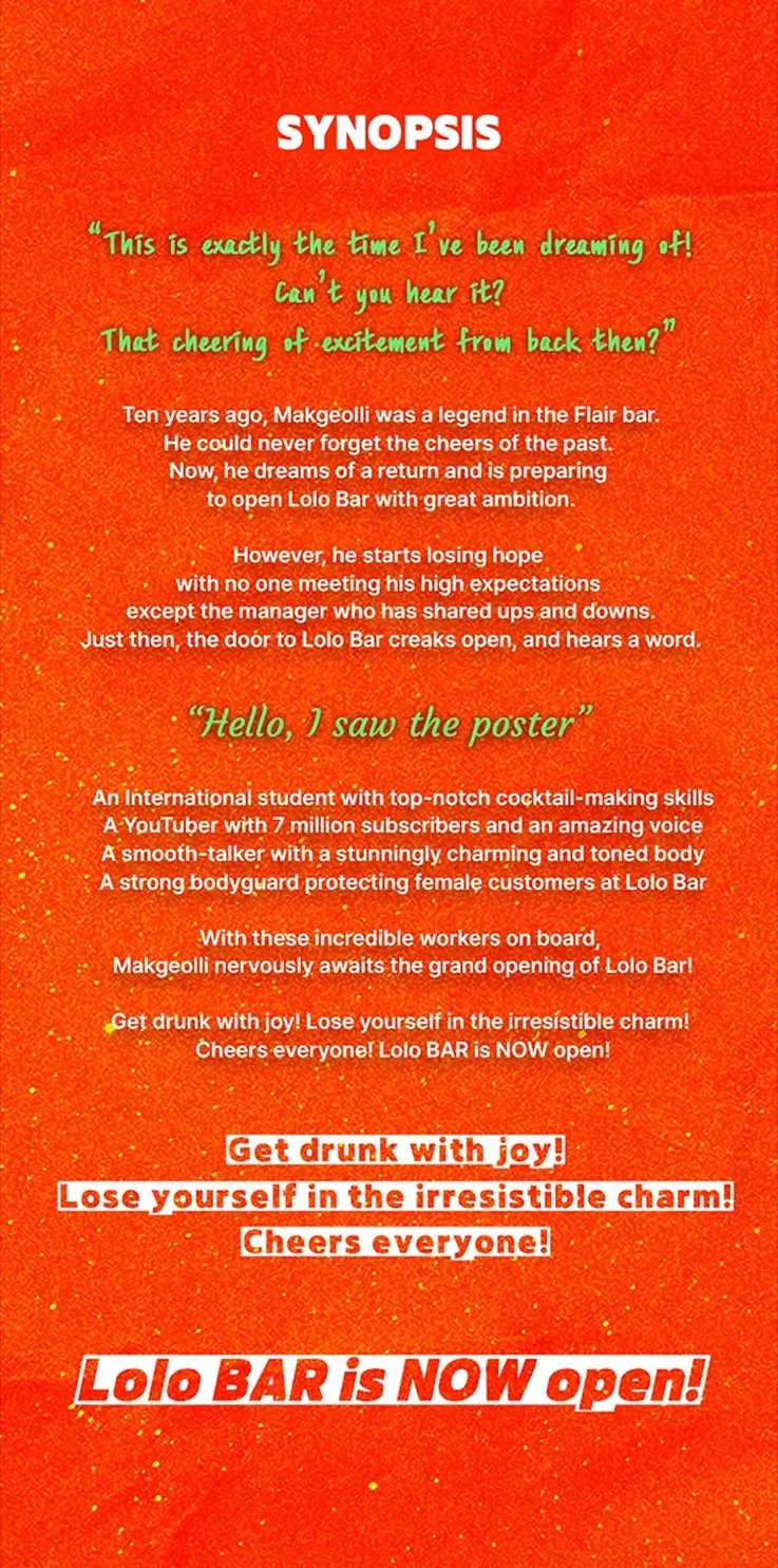 | Synopsis | Once hailed as a legend of Play Bar, Makgeolli clings to the memory of a cheer that defined his glory days. Ten years later, driven by ambition and nostalgia, he prepares to launch Lolo BAR — hoping for a second chance. Just as doubts begin to overshadow his dream, a single visitor reignites his spirit. Joined by an unexpected team — a foreign student with flair, a viral YouTuber, a magnetic charmer, and a watchful guard — Makgeolli opens the doors of Lolo BAR, heart pounding, to a night that could change everything. |