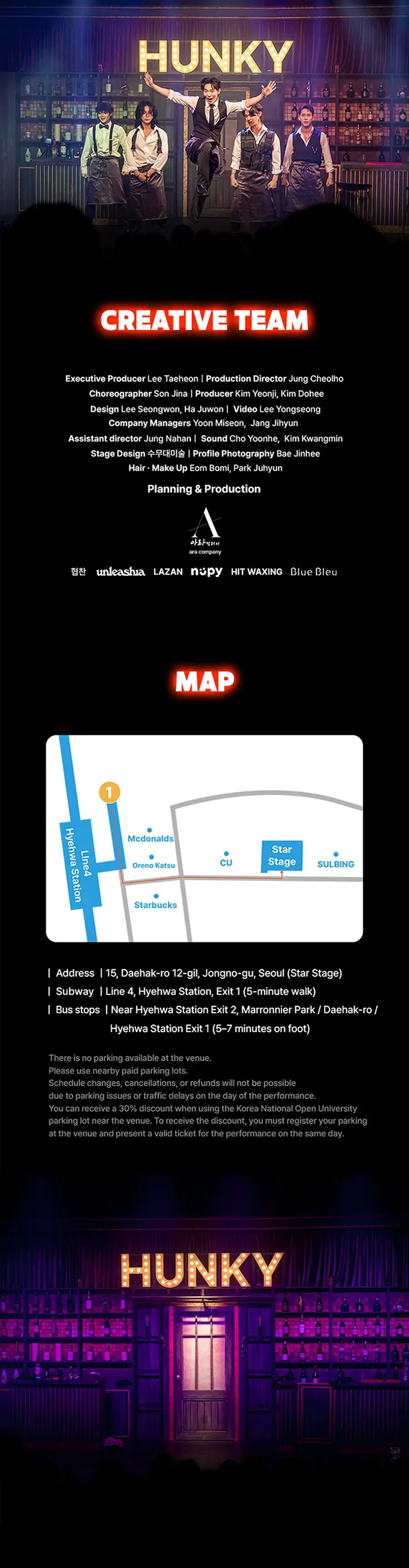 The musical is held at Star Stage in Daehakro. The closest subway station is Hyehwa Station (Line 4).
