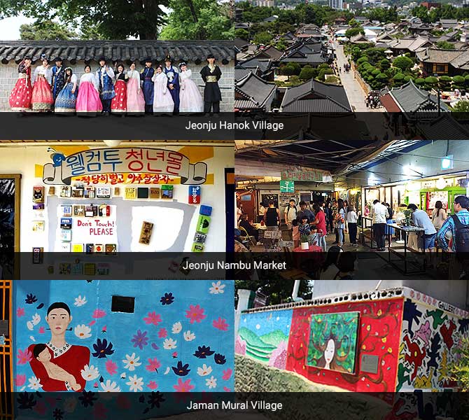 | 10:00am | Jeonju Hanok Village Jeonju Nambu Market Jeonju Jaman Mural Village - Free time / lunch on your own *Deokjin Park during Lotus Flower Festival (mid-July) |