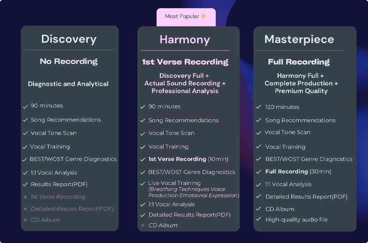 | Harmony (90 minutes) | Person 1 2 | - Song recommendation - Vocal training - Full verse recording (1 verse) - Professional vocal analysis report (5-8 pages) | |