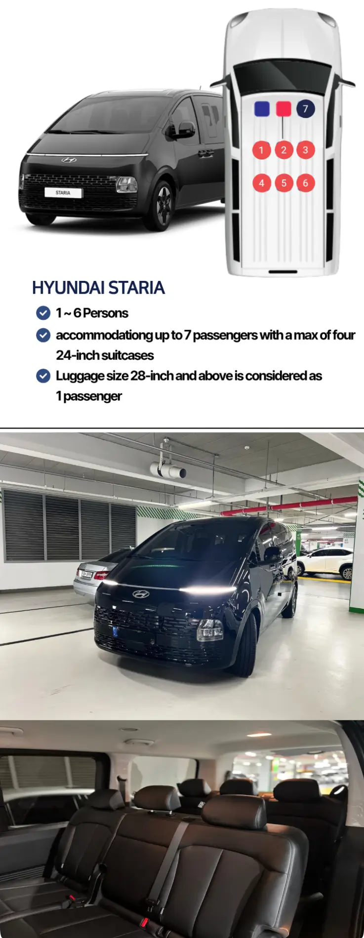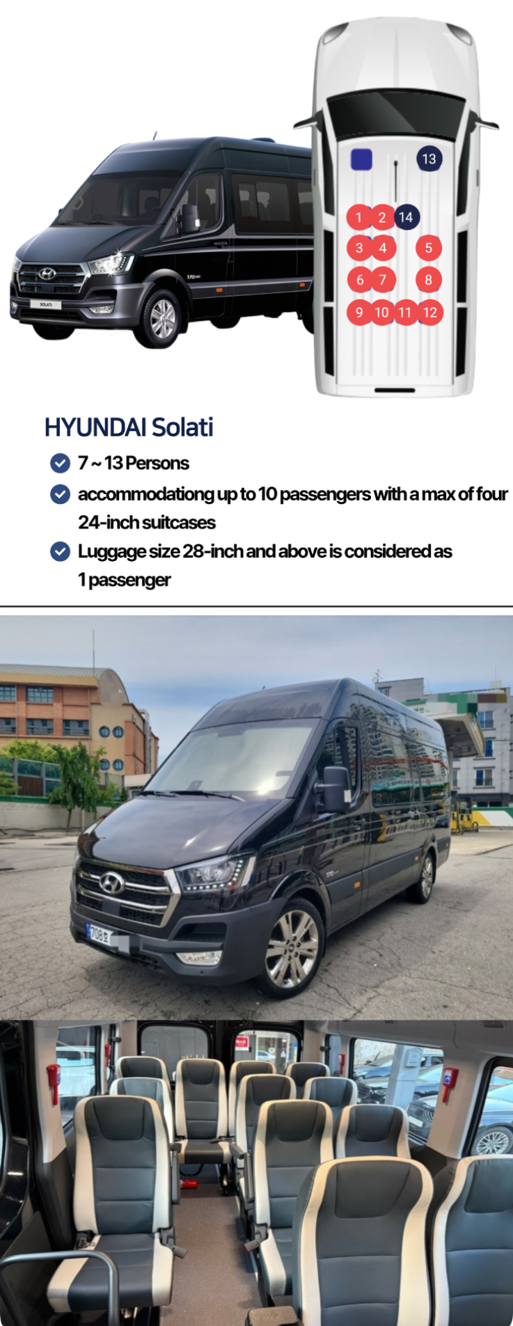 | Busan Tour (10 hours) | Van (up to 6 passengers) Big van (up to 13 passengers) [Optional] Pick-up from Daegu Airport Drop-off at Daegu Airport | - Private vehicle - English/Chinese-speaking driver (basic level) - Hotel pick-up & drop-off - Fuel & toll fees - Driver's meals | |