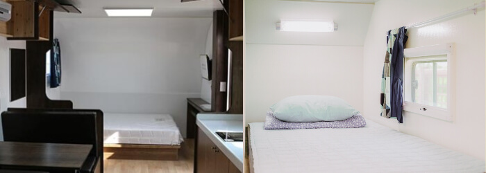 • A caravan has 1 2-person bed & 2-story beds (bedding for 4 people), 1 bathroom, and 1 kitchen.