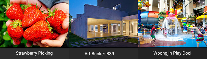 Make a remarkably memorable winter holiday in Gyeonggi-do with this ultimate one day tour! Pick decently ripe strawberries, one of the must-try fruits in Korea during the winter, and enjoy the flavorful strawberries. After having a sweet and refreshing time at the farm, move on to the Art Bunker B39 and enjoy the artwork. Wrap your day up at Woongjin Play Doci which is an indoor water park/spa! Chase away the cold in the warm pools and have fun with your kids.