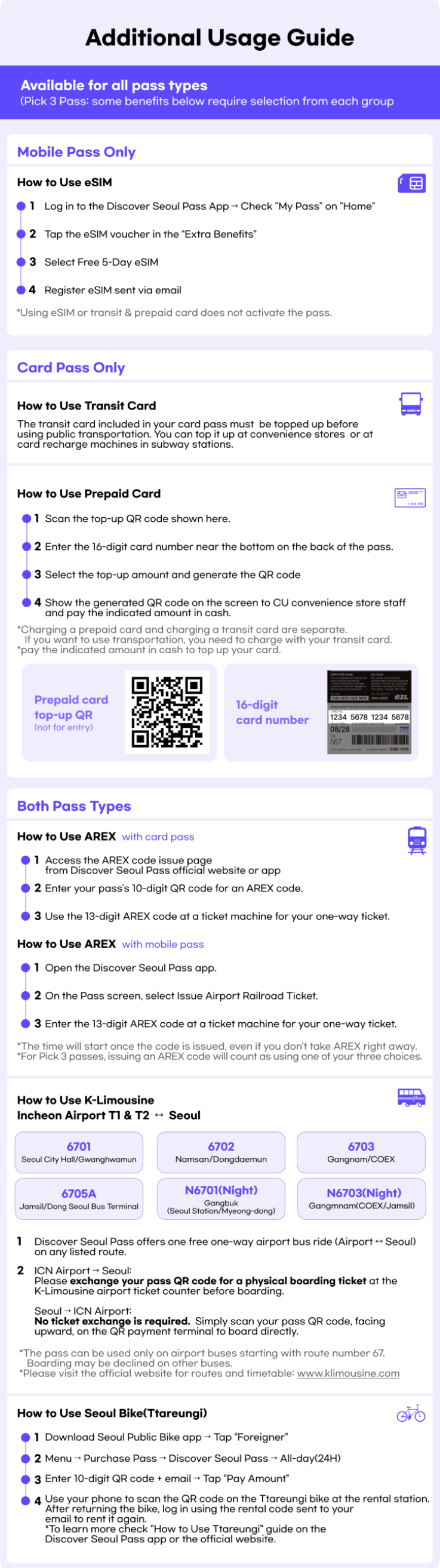 - AREX, Ttareungi (Seoul bike), USIM and traveler's insurance also can be used once within the pass duration.
