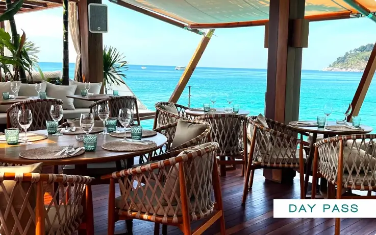Spend the morning at a multi level beach club set above the Andaman Sea, complete with music, poolside lounging, and open ocean views. Enjoy the resident DJ, cool off in the 22 meter infinity pool, and settle into your preferred seating while taking in the 360 degree surroundings. The restaurant offers panoramic views for those who want a relaxed meal over the water. Shuttle boats run every few minutes, giving you an easy and scenic arrival.