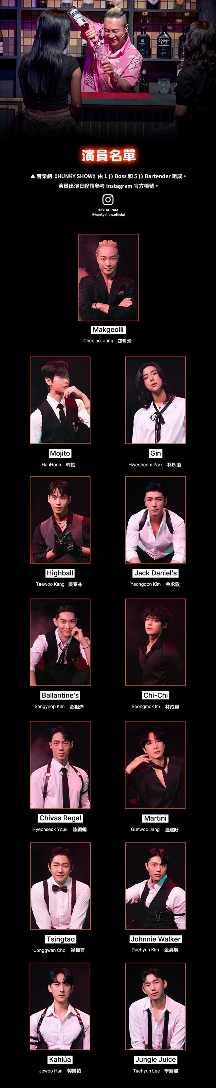 準備好迎接一場充滿歡笑與魅力的夜晚吧!Hunky Show 強勢回歸首爾 Star Stage,這是一場專為女性觀眾打造的特別音樂劇,節目內容幽默風趣,精彩不斷,保證讓女性觀眾大飽眼福、笑聲連連。故事背景設在傳奇酒吧「Lolo BAR」,傳奇調酒師召集了一群魅力爆棚的男人,為妳打造最終極的 Girls’ Night Out!